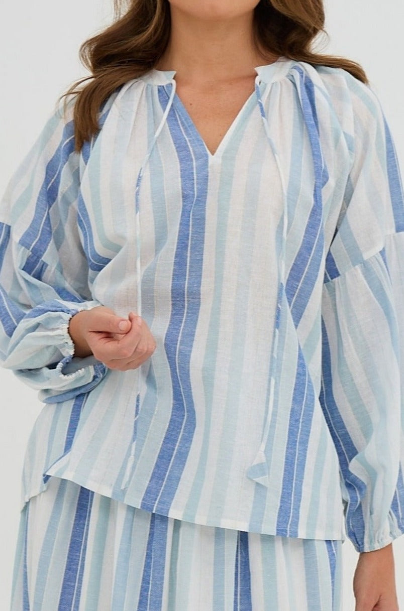 Our obsession with stripes continues and we can't get enough of our tonal blue yarn dyed stripe with a hint of gold lurex to elevate the everyday. Super relaxed and easy to throw on and go, Indy features a dropped shoulder and tassel detailing at neckline. It is a long sleeve, full length blouse crafted from our timeless blue yarn dyed multi stripe.