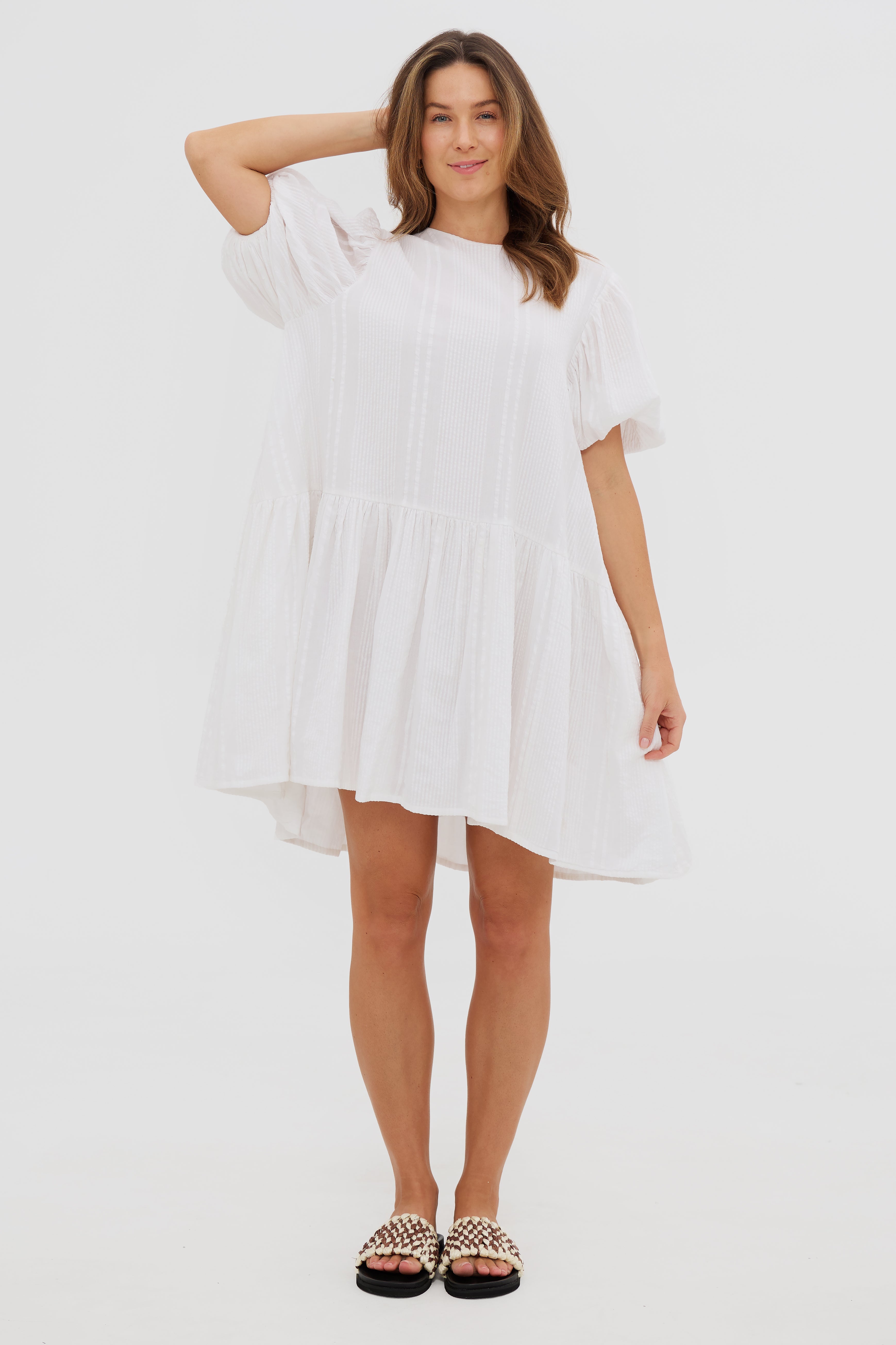 Featuring a universally appealing drop waist and statement balloon sleeves, it has round neckline and full volume through the body with side seam pockets (our favourite!)