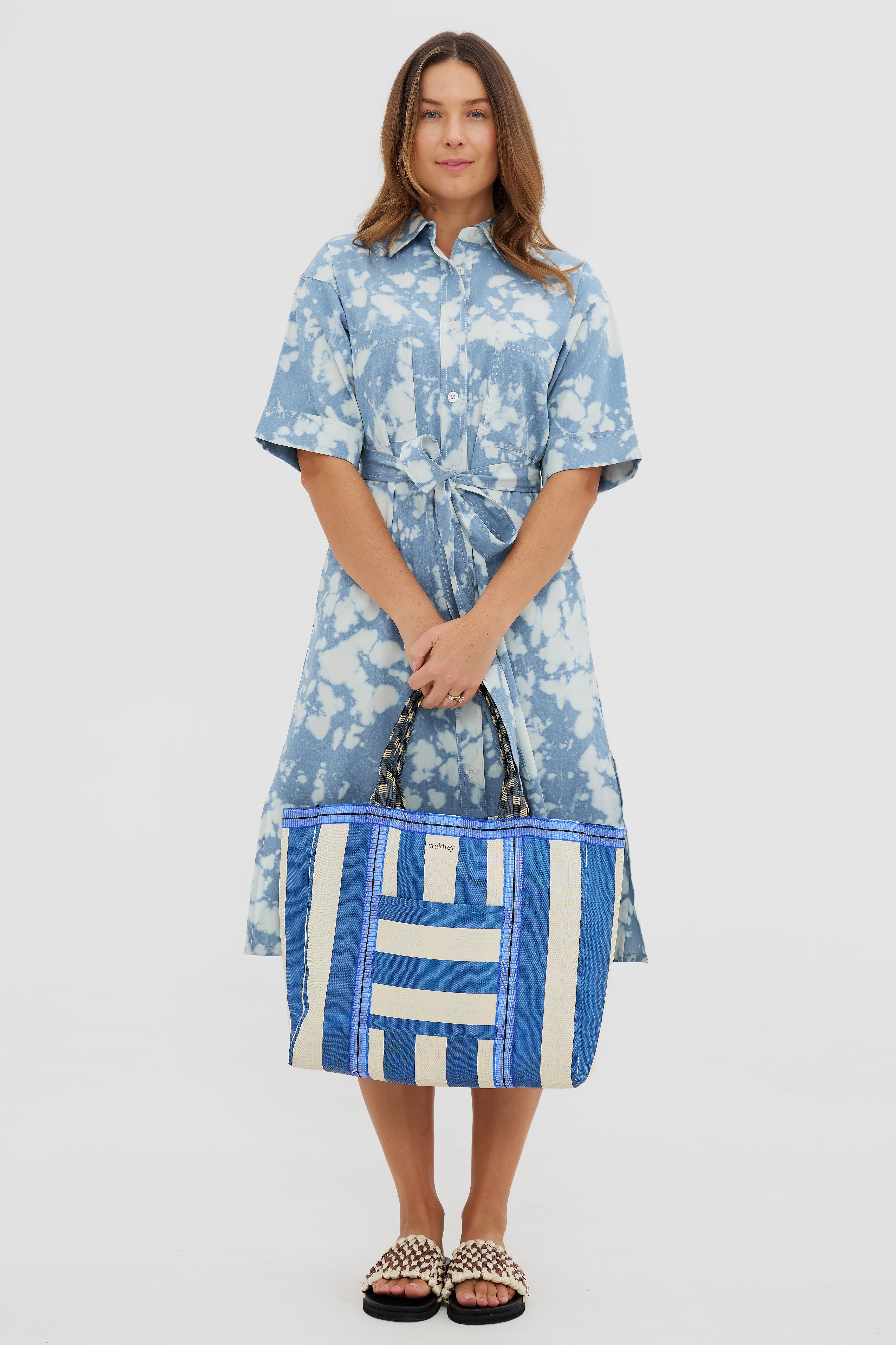 Inspired by mottled sunlight and sun-bleached vintage denim shirts, our Noe Denim Shirt dress in a washed dye effect is stamped entirely by hand by our artisan partners in India. Each and every piece is unique in it's character and washes to perfect that lived-in look.