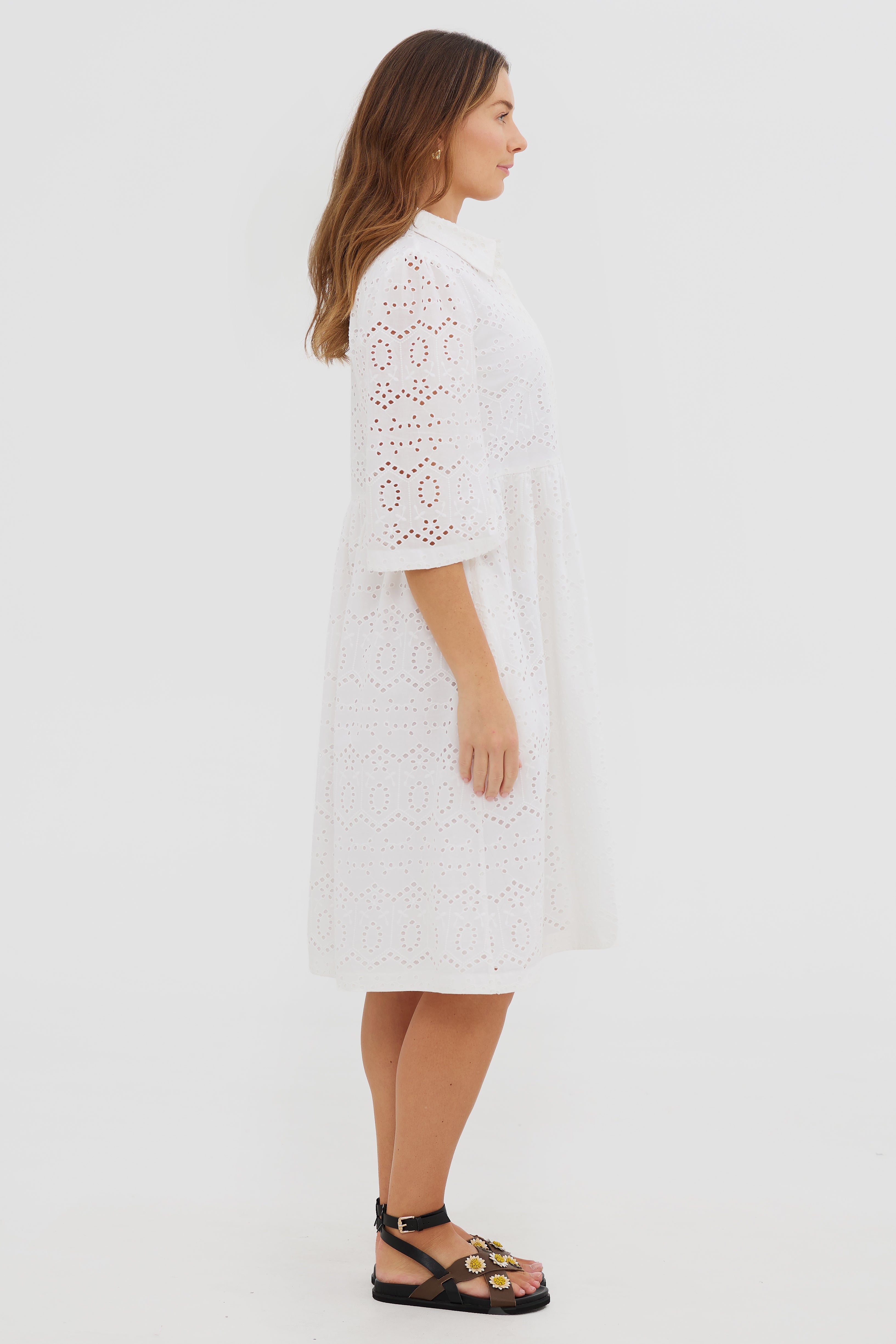 Packed with flattering design elements, this pullover midi dress is predicted to be a popular sell-out favourite. Meticulously crafted from 100% cotton broderie anglaise in an all over floral pattern, it is the epitome of effortless style. Featuring a collared neckline with concealed buttons through the front and dual inseam pockets for everyday functionality. The A-line silhouette is lined through the body in 100% cotton voile and features kimono sleeves for that perfect hint of modern femininity.